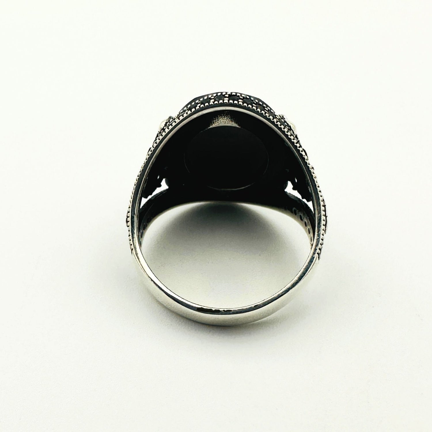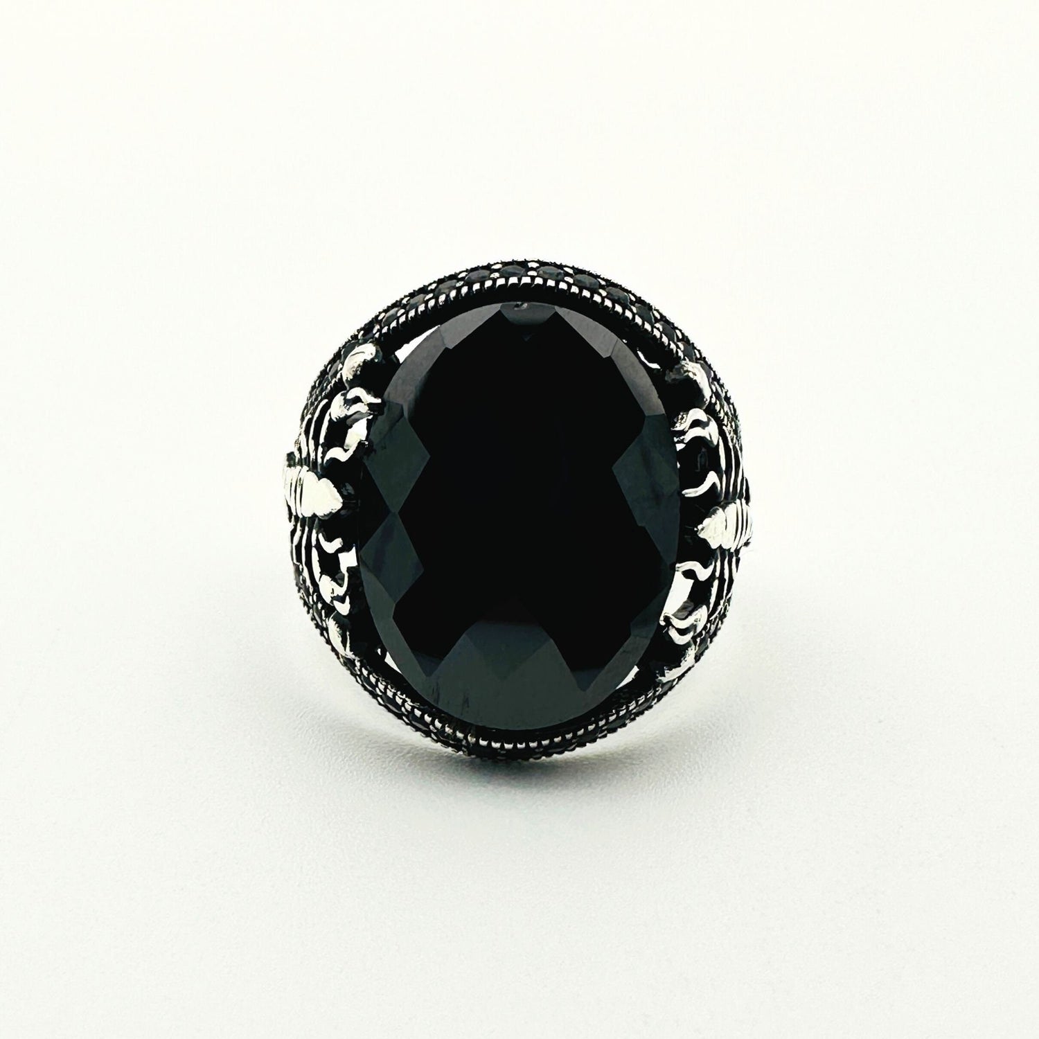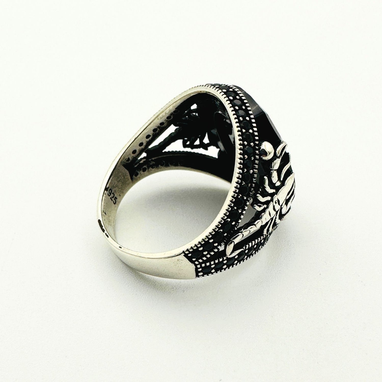 Crafted with premium 925 sterling silver, this ring offers lasting durability and a brilliant shine. It features a prominent black onyx stone, known for strength and protection, beautifully complemented by shimmering zircon stones for an added touch of sophistication. The intricate scorpion detailing is a powerful symbol of passion and resilience, making it an ideal choice for horoscope enthusiasts or those drawn to symbolic designs. With a substantial feel of approximately 11 ± grams (depending on size), this authentic Turkish craftsmanship piece is truly a work of art.