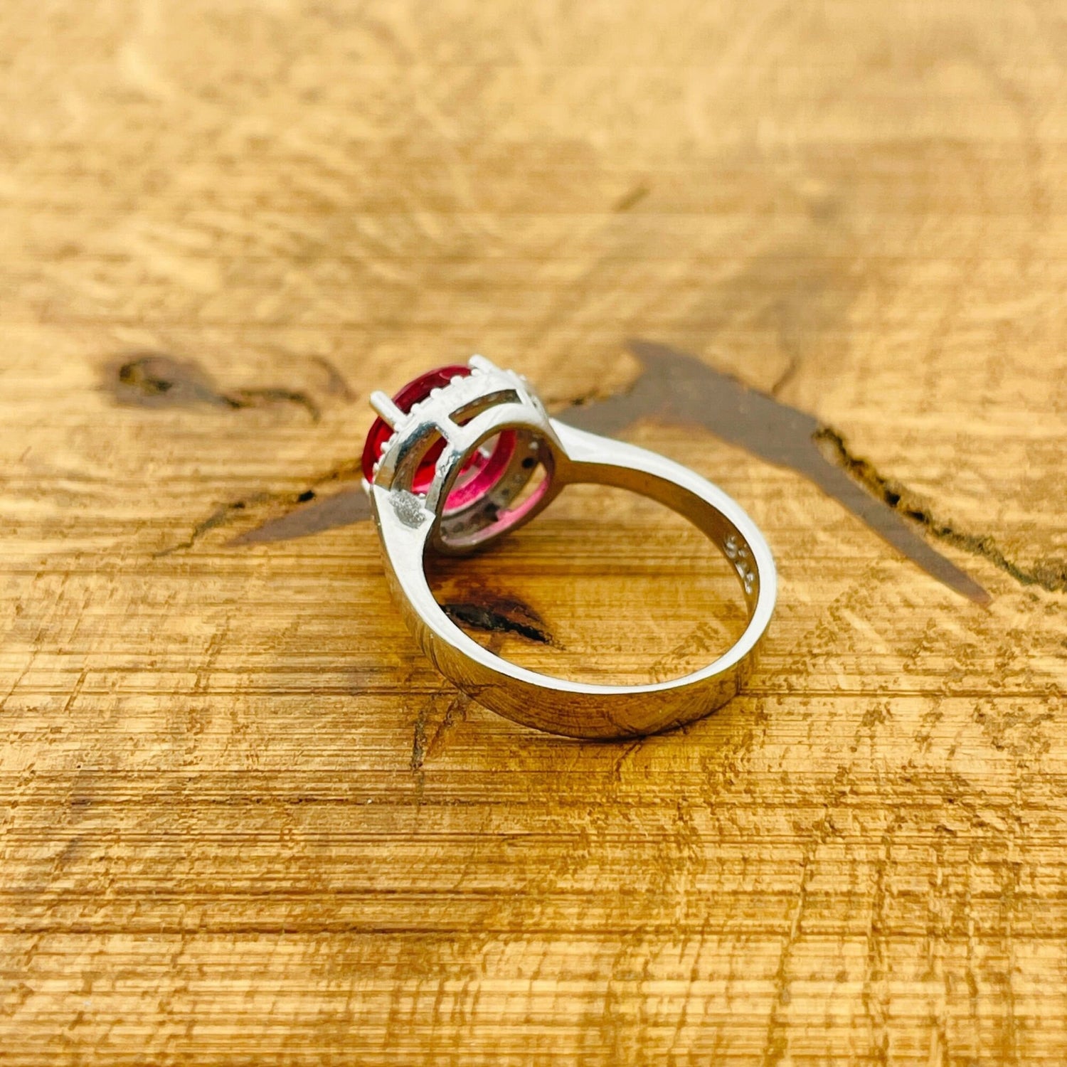 Adorn your hand with the subtle brilliance of this ruby ring, feeling the delicate weight of sterling silver and the captivating glow of the ruby, a truly enchanting experience.