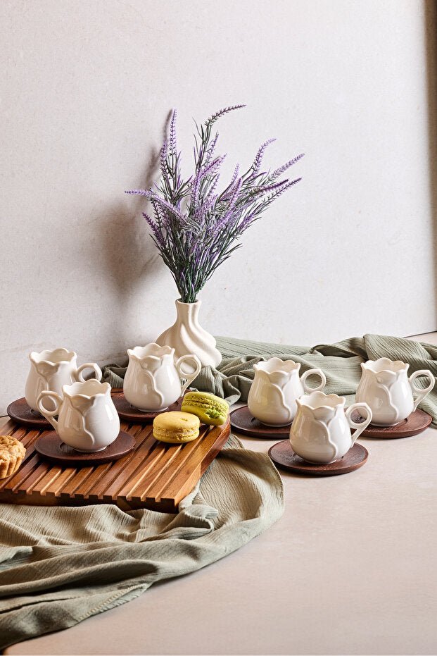 Crafted from fine porcelain, each cup features a delicate "Gul Yapragi" (Rose Leaf) motif, adding an artistic touch to any beverage service. Paired with natural acacia wood saucers, this set blends contemporary elegance with organic warmth, creating a memorable presentation.