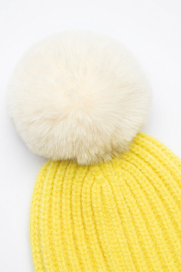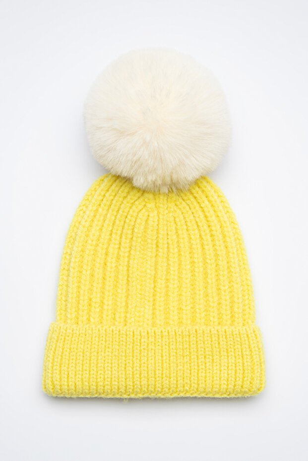 Yellow child's Pom-pom Beanie - cozy Ribbed Knit