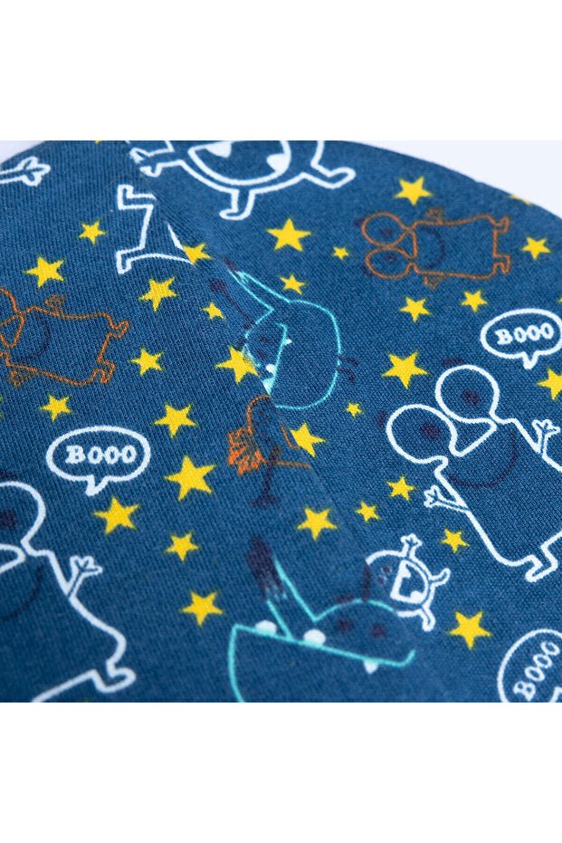 • Reversible Design: This versatile set includes two beanies – one in a classic plain blue and another featuring a fun, vibrant pattern with stars and playful characters saying "BOOO"!