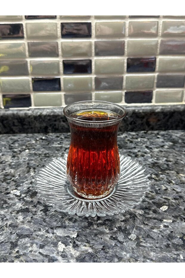 Each set features six beautifully designed Pasabahce Echo tea glasses, renowned for their clear, robust glass construction, paired with six coordinating imported saucers. Perfect for serving traditional Turkish black tea, these glasses allow the rich color of the tea to shine, enhancing the overall drinking ritual.