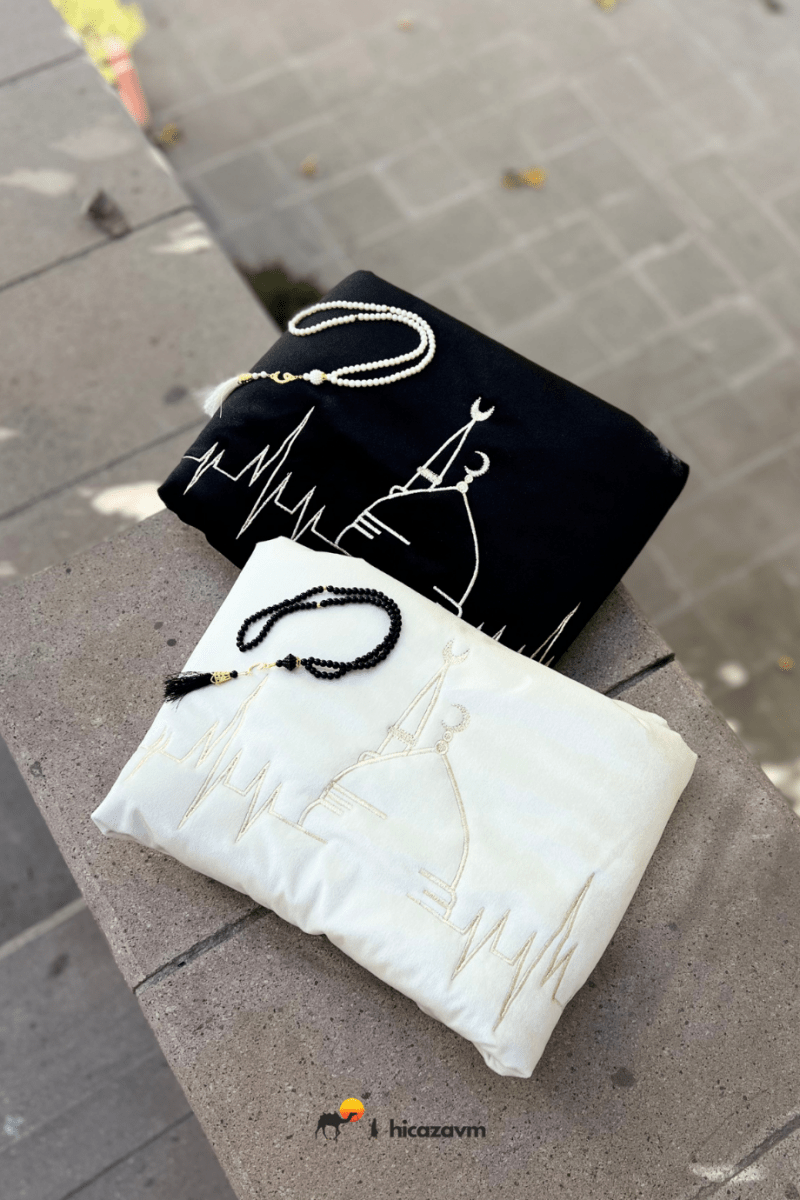 Experience unparalleled comfort and elegance with this exquisite prayer rug set featuring gold embroidery. Perfect for your peaceful prayer rituals, this set comes in black and white colors.