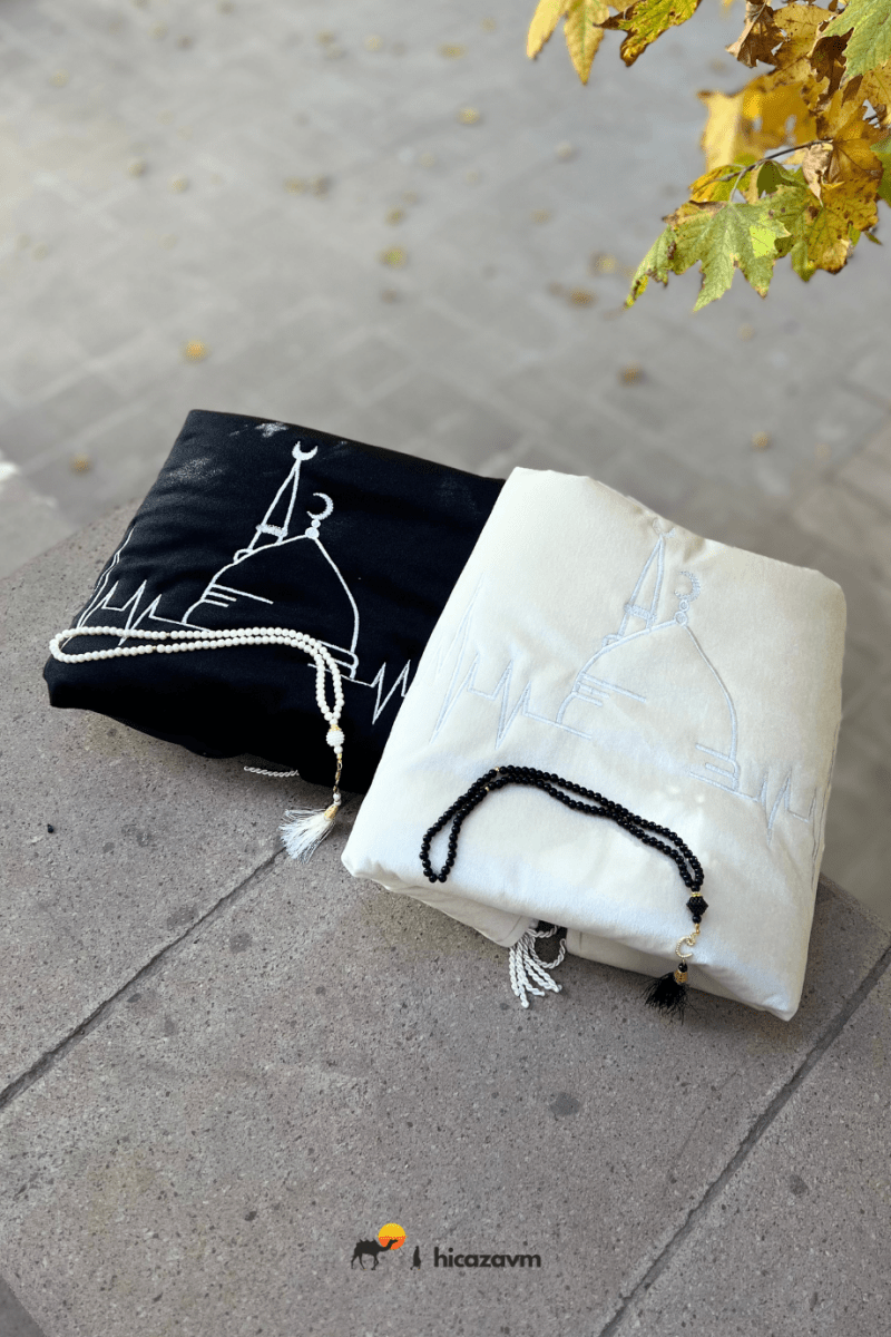 Indulge in elegance and serenity with this silver-embroidered prayer rug set. Enhance your prayer experience with luxurious details and exquisite craftsmanship. This set is available in black and white colors.