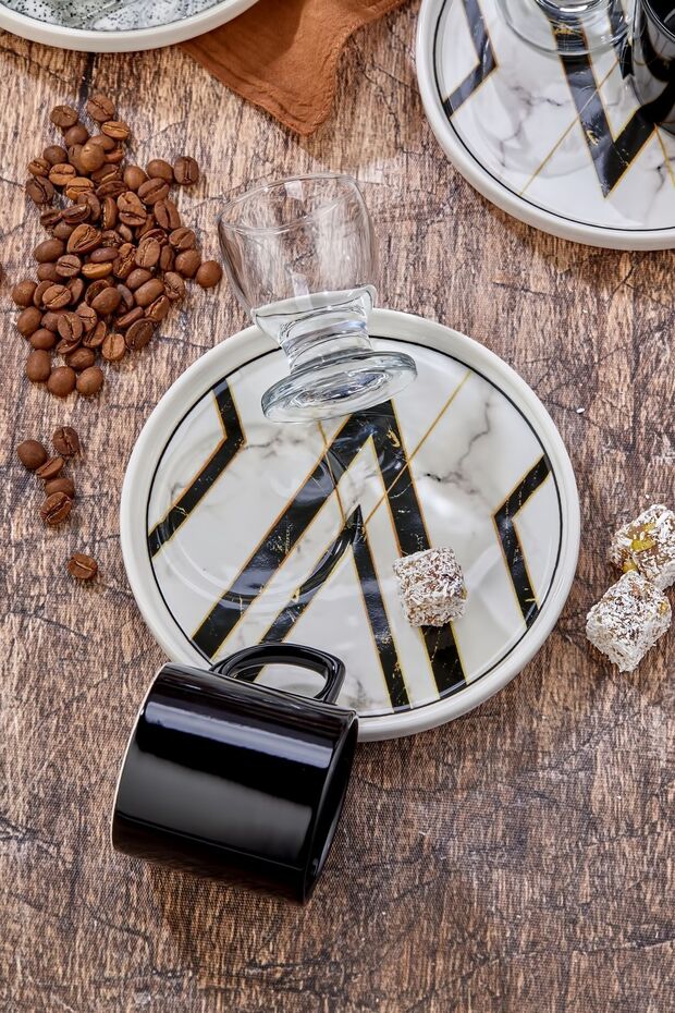 Each set includes six beautifully crafted coffee cups with matching saucers, complemented by six elegant water glasses – perfect for the traditional accompaniment to Turkish coffee. Made with premium materials, this set combines timeless design with robust durability, ensuring long-lasting appeal and customer satisfaction.