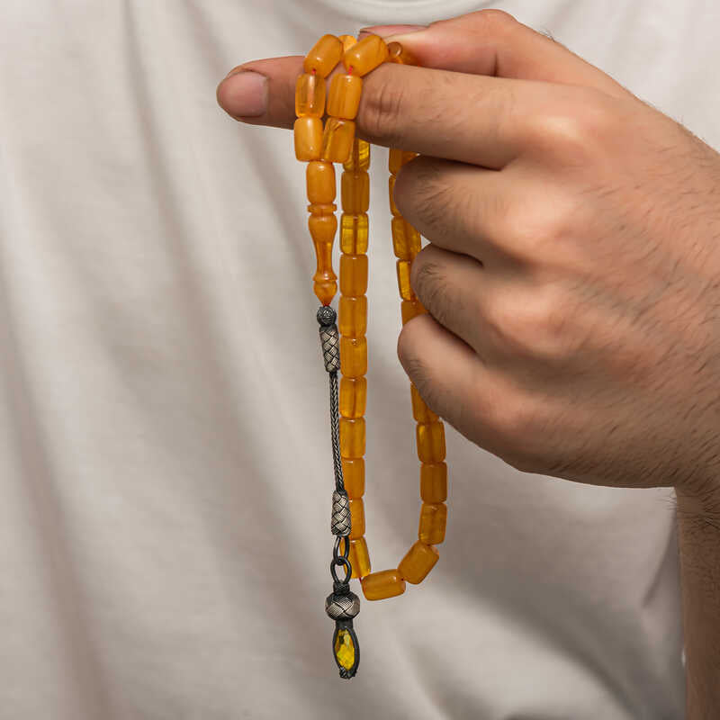 Chapelet de prière Tesbih - Ton ambre avec gland Kazaz en argent fait main