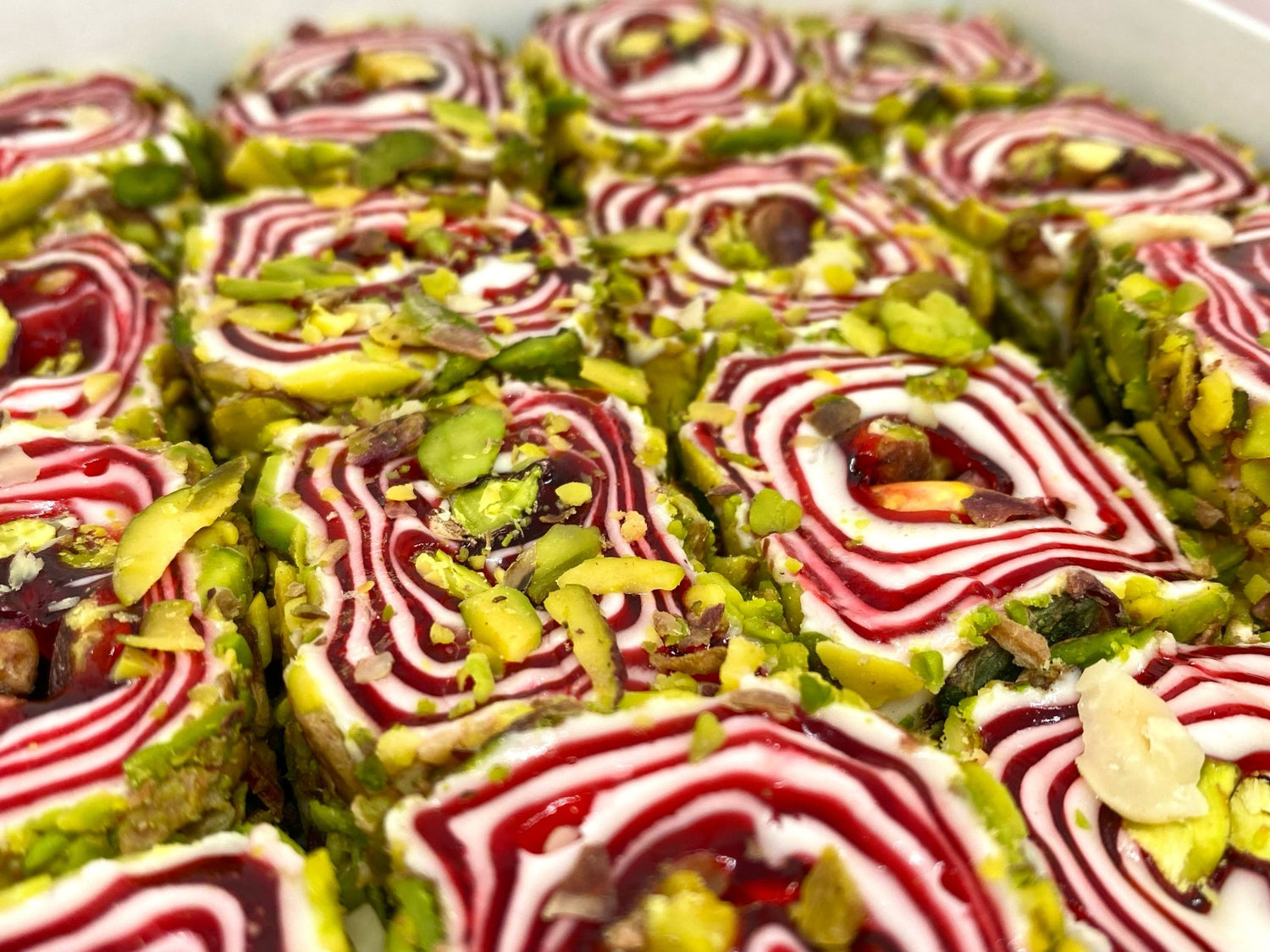 オスマンラップは、ガニク・サルスルタンの最高級トルコデザートの一つです。この種類は、プレミアムなアンテップピスタチオを、甘くフルーティーな赤い層と白くクリーミーなヌガーのような層の両方で作られた芯の間に重ね、すべての材料をラップ状に巻き、さらに刻んだアンテップピスタチオで覆っています。見た目の美しさと同じくらい美味しいです!