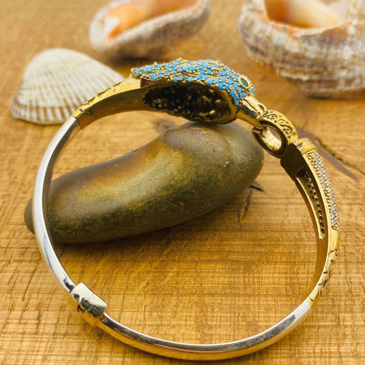 Handmade Turkish JewelryThis 925 sterling silver bracelet features a vibrant turquoise gemstone and a bold tiger design. Perfect for those who love animal-themed jewelry, this is a great gift for her.