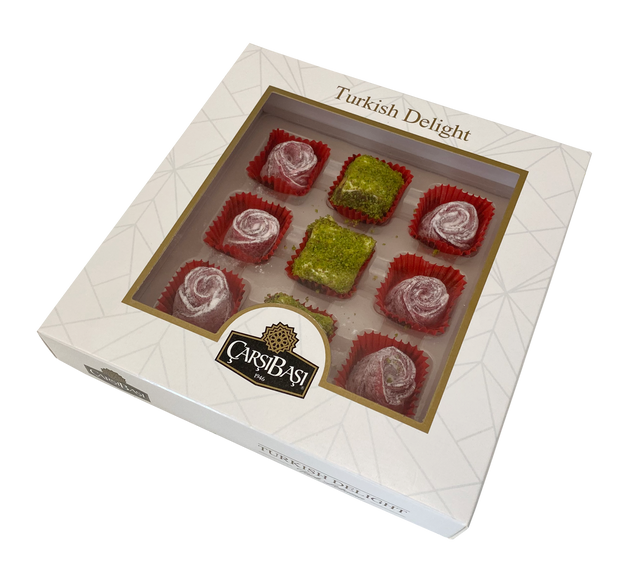 Carsibasi プレミアムアソート トルコのデライトで、お客様に本格的なトルコの伝統の味を提供しましょう。このエレガントな180gのウィンドウボックスは、洗練された販売準備ができたギフトで、最も人気のあるロクムのフレーバー2種類を9個詰め合わせています。
