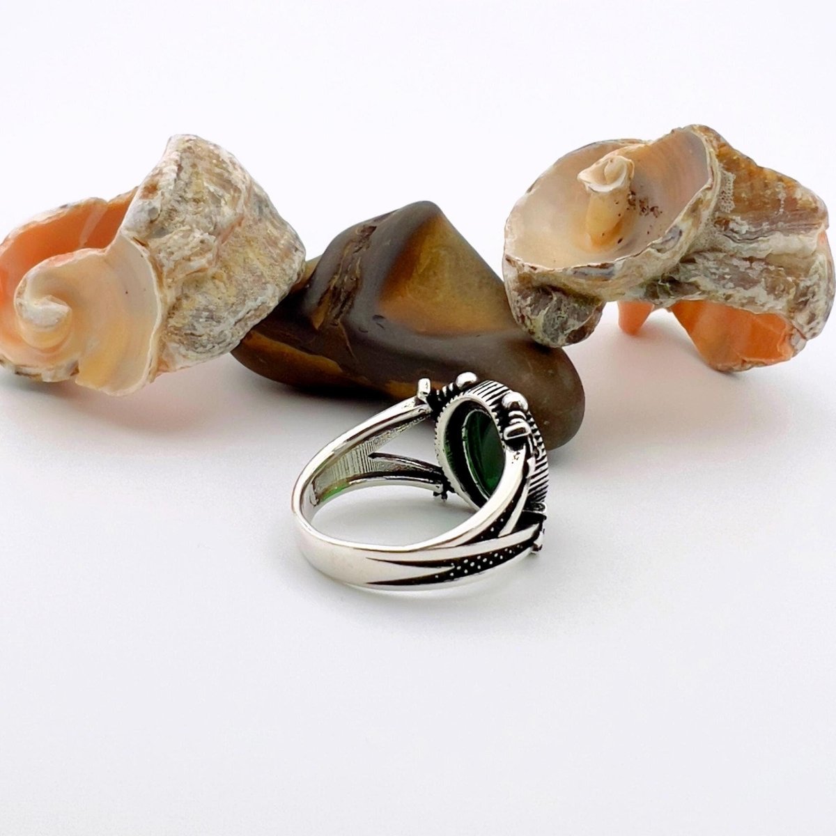 - 鮮やかなグリーンエメラルドの石と剣のデザインが特徴です。