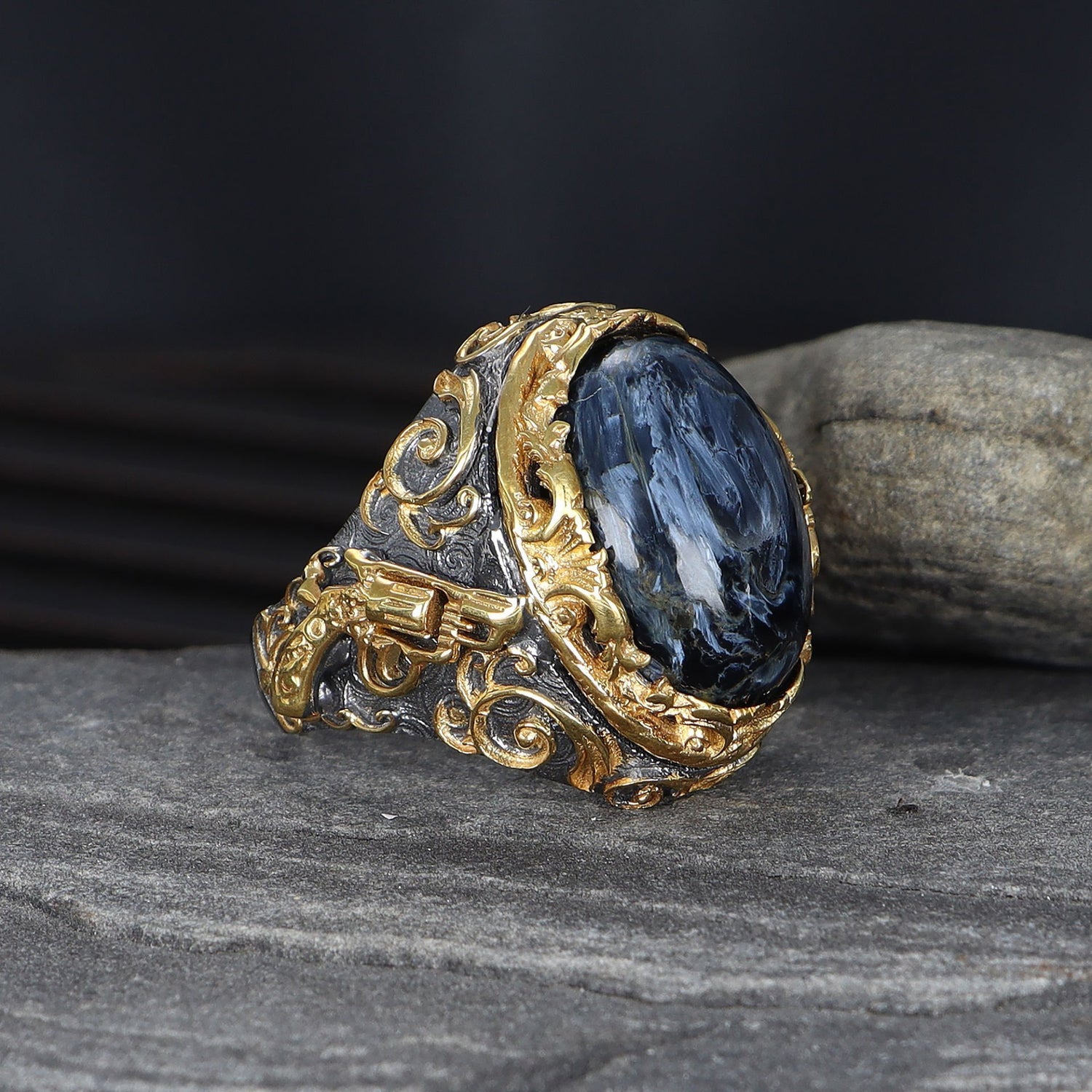 Embrace Style with Armed Model Grinding Coated Petersite Stone Silver Ring for Men