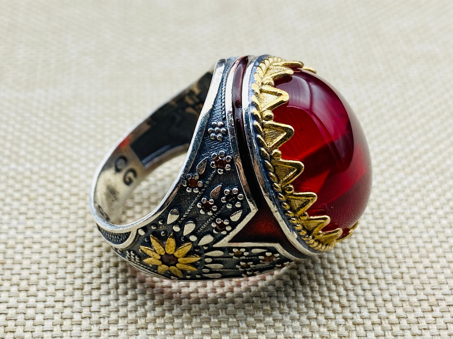 터키 오스만 전통으로 제작된 925K 스털링 실버의 이 특별한 아게이트 스톤 남성 반지로 스타일을 향상시키세요. 생동감 넘치는 빨간 아게이트 스톤은 우아함과 매력을 발산하여 이 반지를 돋보이는 액세서리로 만듭니다. 그를 위한 선물이나 개인적인 사치로 완벽한 이 독특한 아키크 예멘 반지는 뛰어난 장인 정신의 증거입니다.