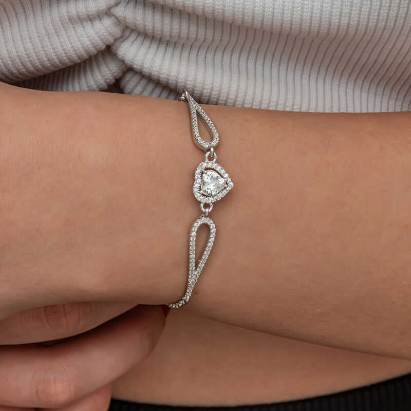 Gemaakt van hoogwaardig sterling zilver, heeft deze armband een schitterende hartvormige zirconia steen in het midden, omringd door kleinere, fonkelende pave-gezette zirconia’s. De delicate schakels, ook versierd met glinsterende pave zirconia’s, creëren een continue sprankeling die het licht prachtig vangt bij elke beweging. Het verfijnde ontwerp combineert moeiteloos klassieke charme met eigentijdse allure.