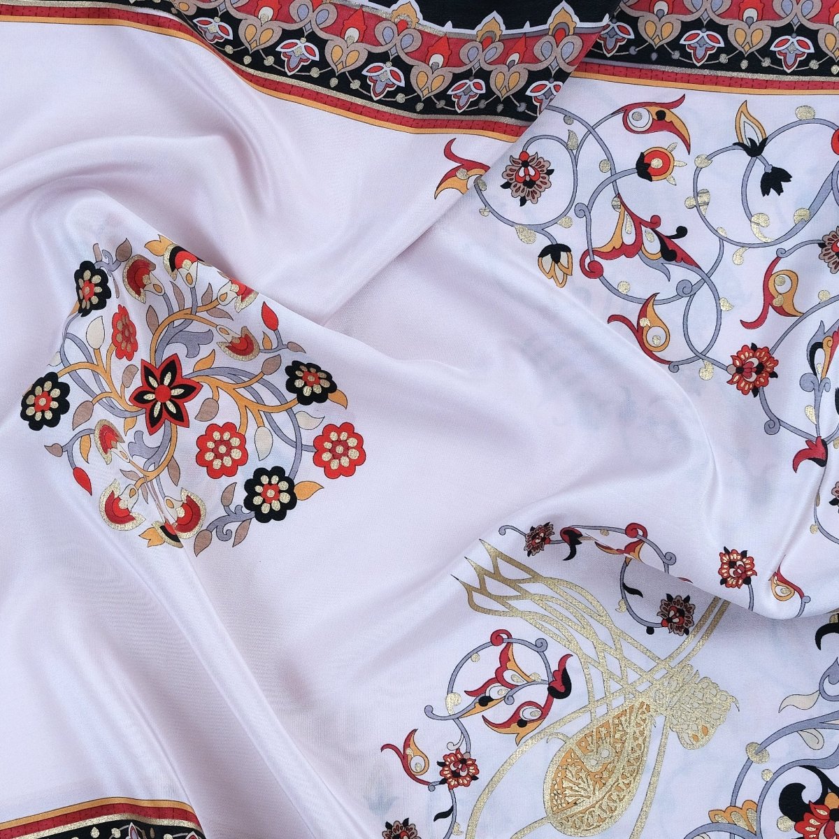 This exquisite black scarf with striking red designs is a timeless masterpiece crafted from 100% crepe silk, known for its luxurious texture and softness. Inspired by Ottoman design history, the intricate patterns are meticulously hand-pressed by skilled artisans, adding a tactile quality to its visual elegance, making it a sophisticated and refined accessory.