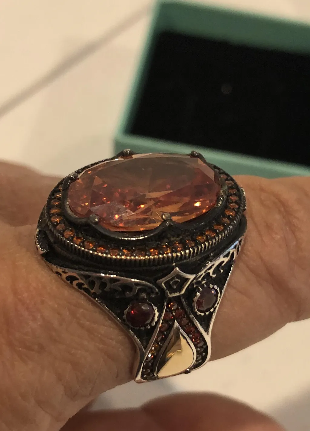 每枚戒指都是土耳其工匠技艺的见证,他们精心打造每一个细节,选用耐用的925纯银。中心镶嵌着一颗令人惊艳的鲜艳橙色黄水晶宝石,以其明亮的色彩和迷人的光彩著称,确保外观既永恒又极具现代感。重量约为21 ± 克,其厚重感彰显了其优质品质和精湛工艺。