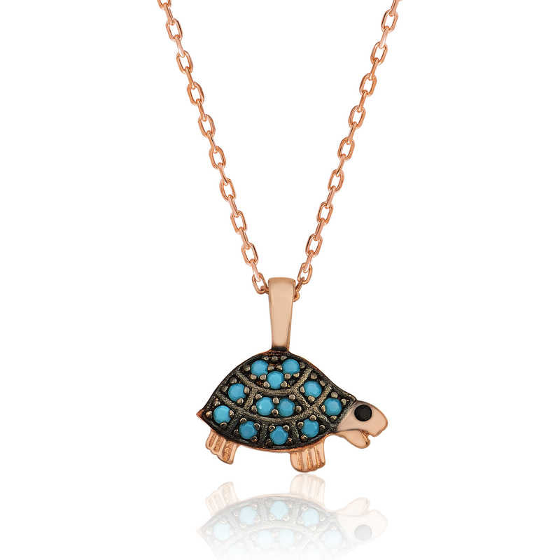 - Elegant Design: A dainty turtle pendant with intricately set turquoise stones, enhanced by a striking rose gold-tone finish.